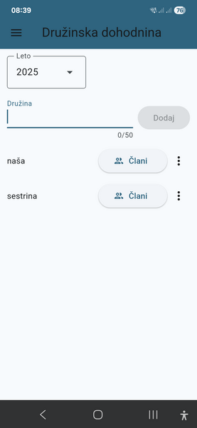 Ko zaženete aplikacijo, se prikaže prva stran, kjer lahko začnete z vnašanjem podatkov. Najprej izberite leto, za katero želite izračun, in prikazale se vam bodo družine, ki že imajo vnesene podatke za to leto.
